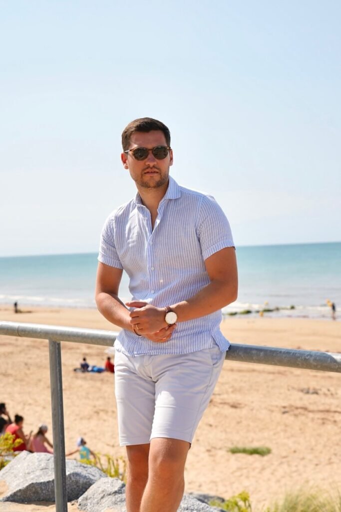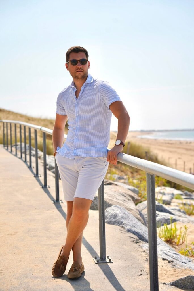 Pour une balade, un déjeuner au soleil ou simplement une fin de journée détendue, je choisis un bermuda bleu clair, bien coupé, que j’associe à une chemise en lin à manches courtes, rayée bleu ciel.