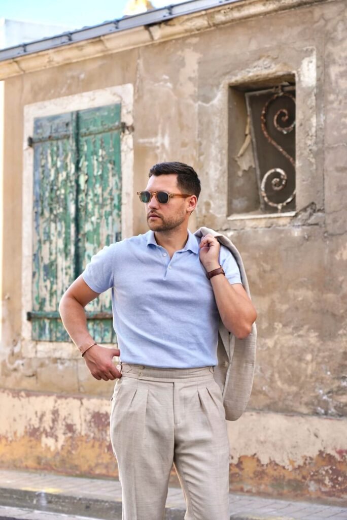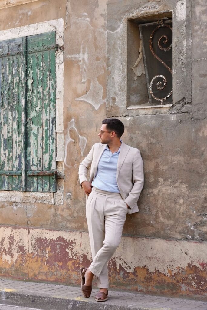 Ici, je porte un costume en lin beige, souple, non doublé, associé à un polo en maille bleu ciel. Une silhouette qui conserve structure et cohérence tout en respirant pleinement.