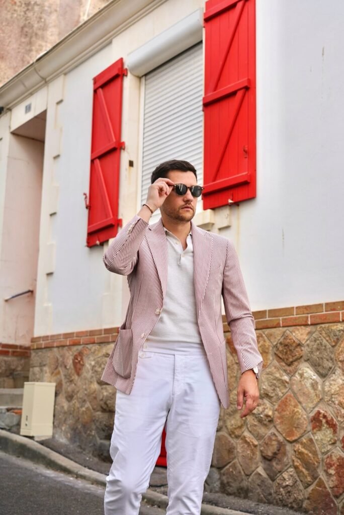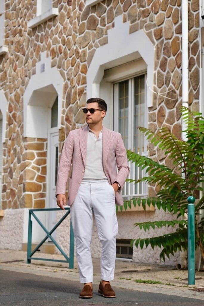 Ici, je porte une veste en seersucker rouge et crème, associée à un pantalon blanc cassé taille haute, une chemise en maille légère et des mocassins en suède marron moyen. L’idée : affirmer une certaine singularité tout en gardant un confort absolu.