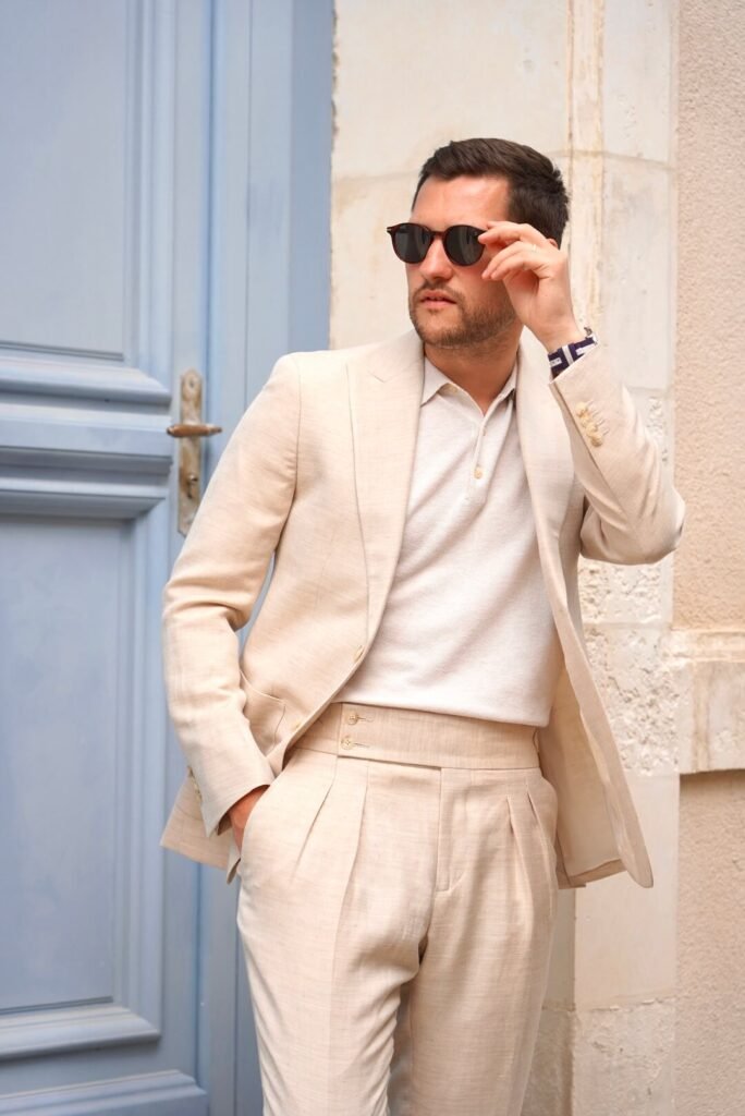 Une veste de costume en lin (ou lin mélangé) est parfaite pour vos soirées estivales. Beige, bien coupée, elle se dépareille facilement et donne instantanément de l’élégance à une tenue.
