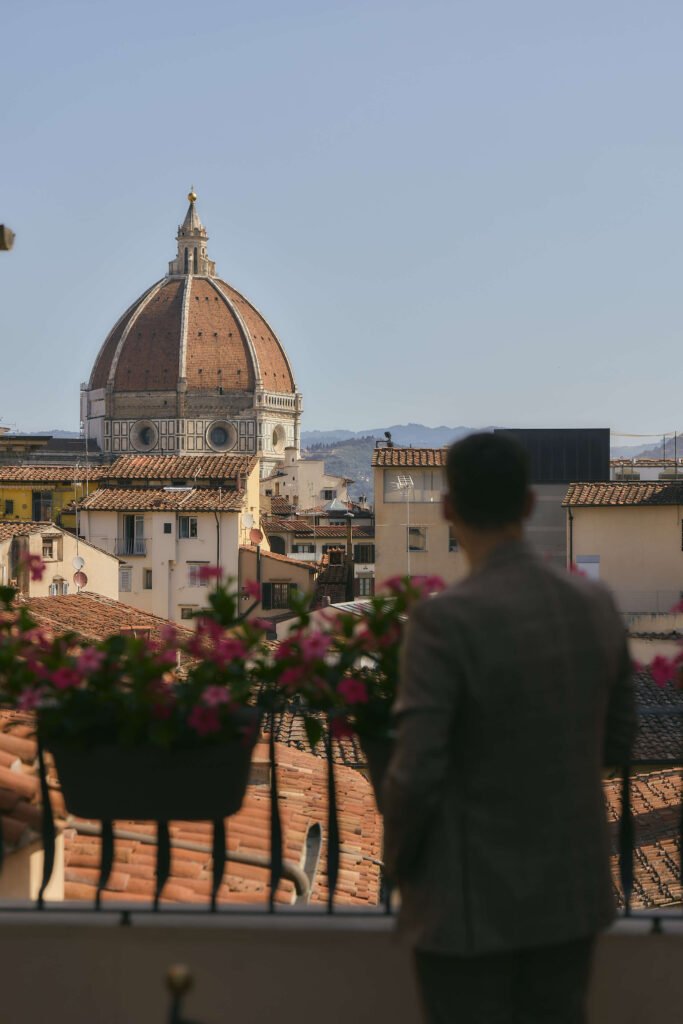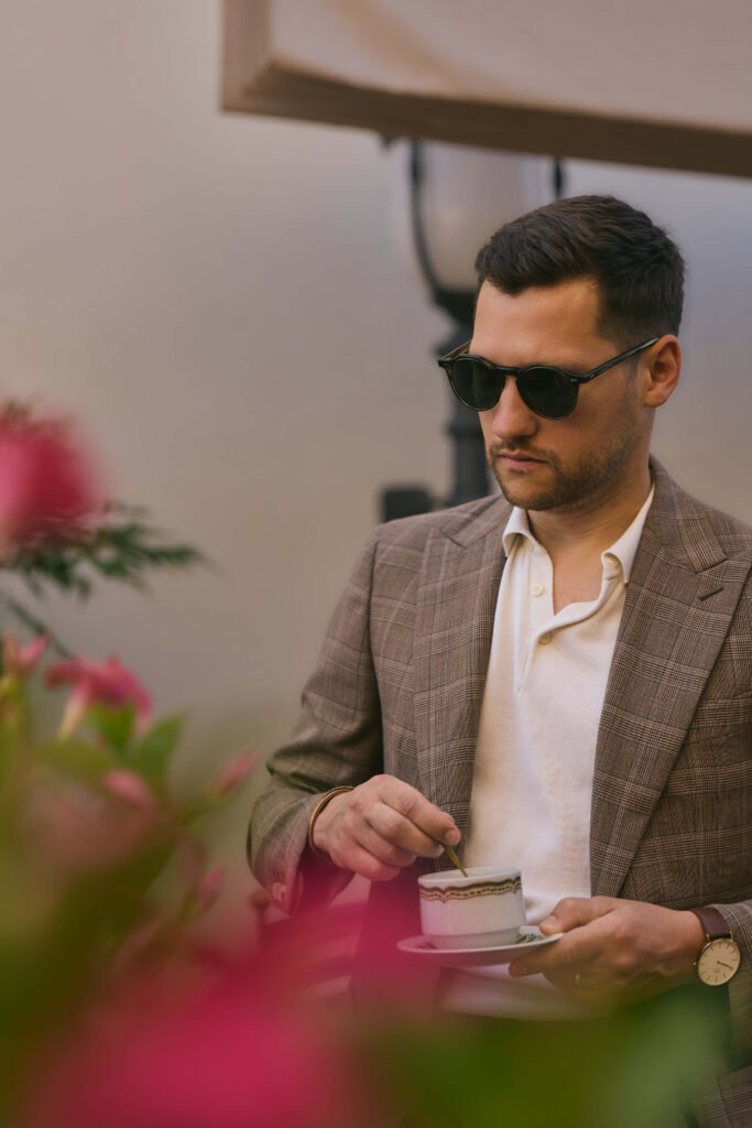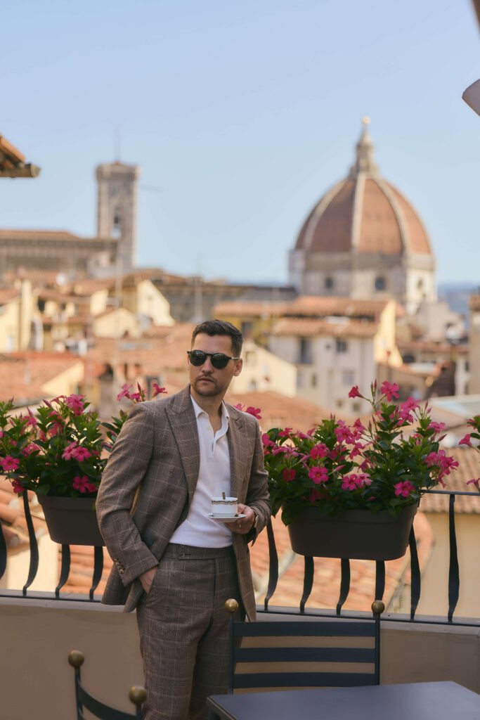 Un grand merci à Fran Calderon, photographe espagnol talentueux, pour ses clichés qui ont su capturer l’essence de cette tenue et l’ambiance particulière de Florence. Son regard a sublimé ce costume Prince de Galles beige, rendant visible ce qui, parfois, ne se dit pas.