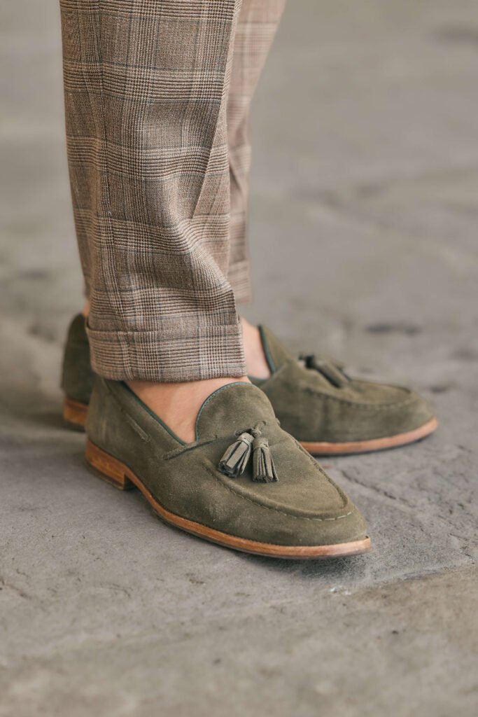 Plutôt qu’une chemise, j’ai glissé sous la veste un polo en maille écru, fin, respirant, col ouvert. C’est là, je crois, que tout s’est joué. Ce geste simple — ne pas chercher à trop « habiller » le costume — donnait à l’ensemble une nonchalance italienne. Une allure sans rigidité. Ce que les Florentins appellent la sprezzatura : l’art de l’élégance sans effort apparent.Et pour rester dans cet esprit, j’avais troqué les derbys ou Richelieus classiques contre une paire de mocassins en suède kaki. Légers, souples, presque silencieux. Une touche terreuse sous un ensemble minéral.