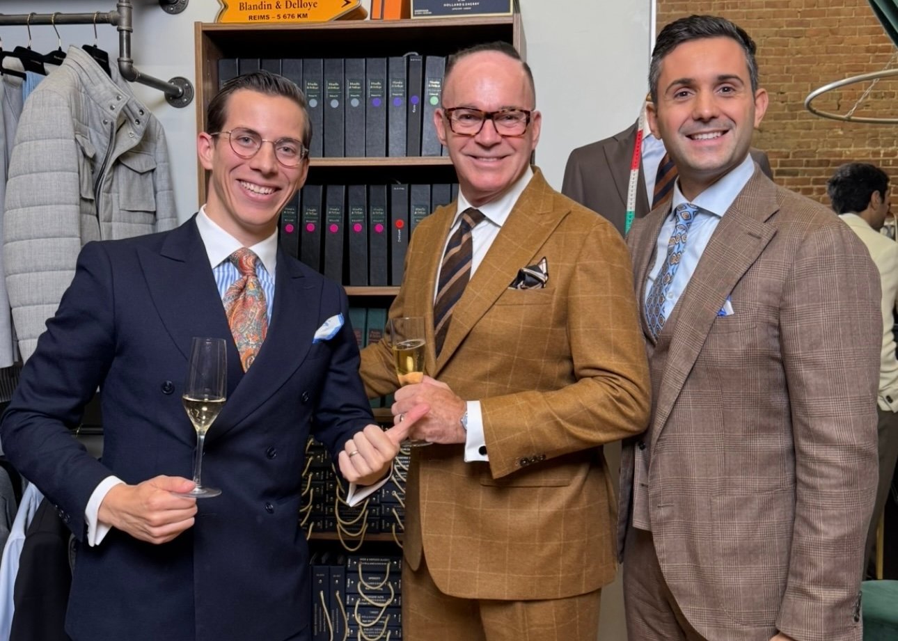 Dès l’entrée dans la boutique de Blandin & Delloye située sur la rue Notre-Dame à un jet de pierres du quartier des affaires dans le Vieux Montréal, l’atmosphère était chargée d’une énergie palpable. Une trentaine de passionnés de mode étaient réunis, tous avec un intérêt marqué pour le sartorial et la couture sur mesure. L’ambiance était soigneusement agencée, à la fois chic et conviviale, créant un cadre idéal pour les échanges. Les lumières tamisées et la décoration élégante ont contribué à une atmosphère chaleureuse où chacun se sentait à l’aise.