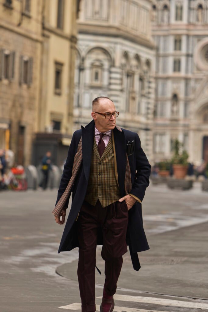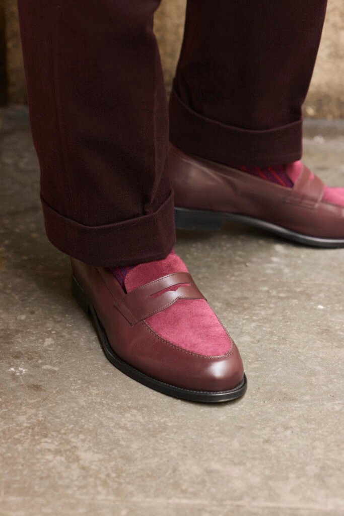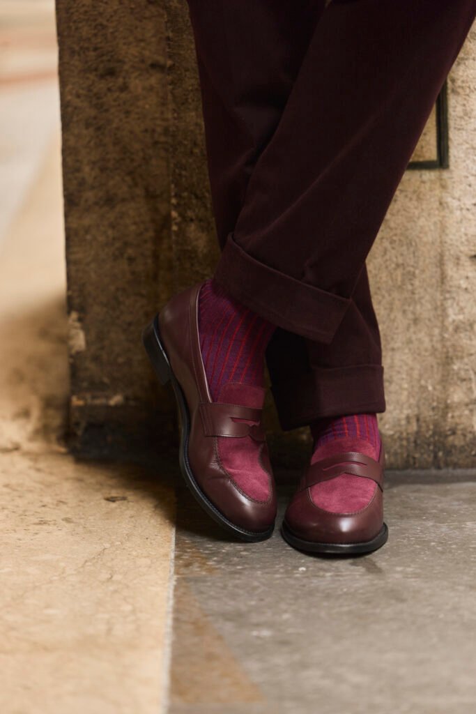 À mes pieds, les mocassins bicolores bordeaux de la maison Hockerty sont le fruit d’un savoir-faire exceptionnel. En plus d’être élégants, ils sont conçus pour le confort, ce qui est essentiel lors des longues journées hivernales. Leur présence lors du prestigieux événement Pitti Uomo a largement marqué les esprits, interprétant le mariage parfait entre tradition et innovation.