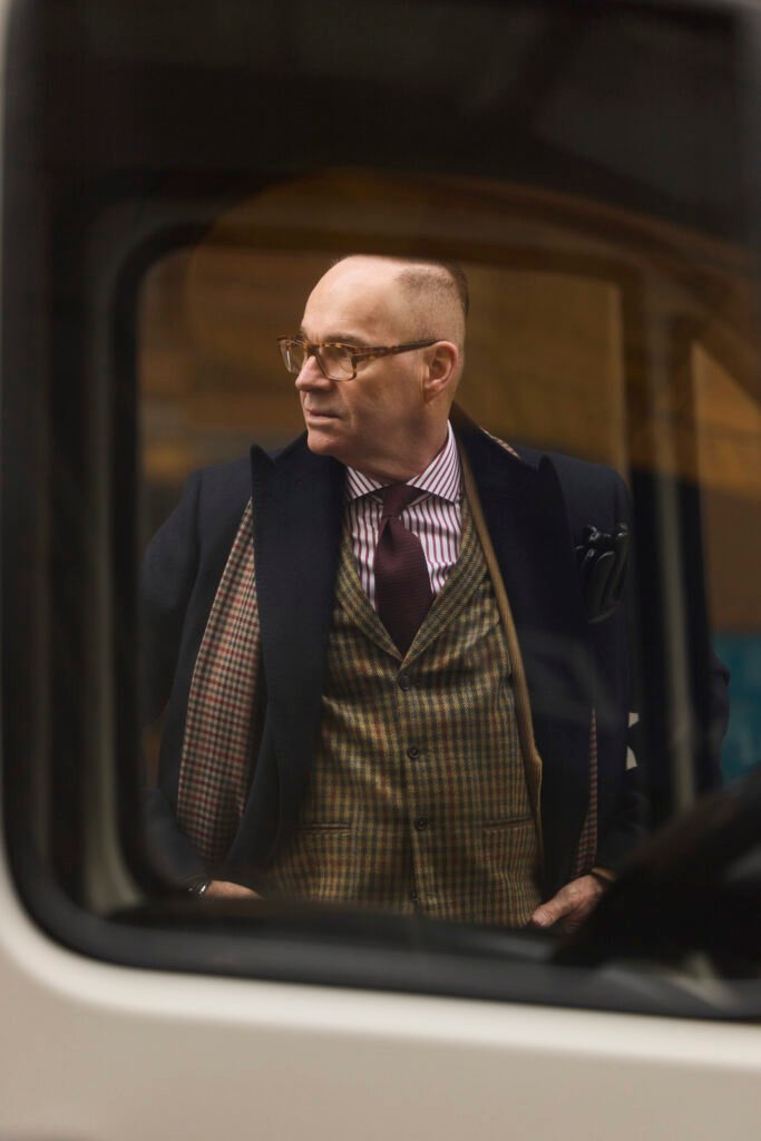Commençons par la pièce maîtresse de cet ensemble : une élégante veste de corderoy beige aux revers larges de la maison Blandin & Delloye. Ce matériau classique, avec sa texture en relief, offre chaleur et style inégalés. La martingale à l’arrière apporte un raffinement supplémentaire, témoignant du savoir-faire artisanal des tailleurs montréalais. Versatile par sa couleur et associée à des pièces de qualité, cette veste devient un élément essentiel d’une garde-robe hivernale qui perdurera au fil des saisons.