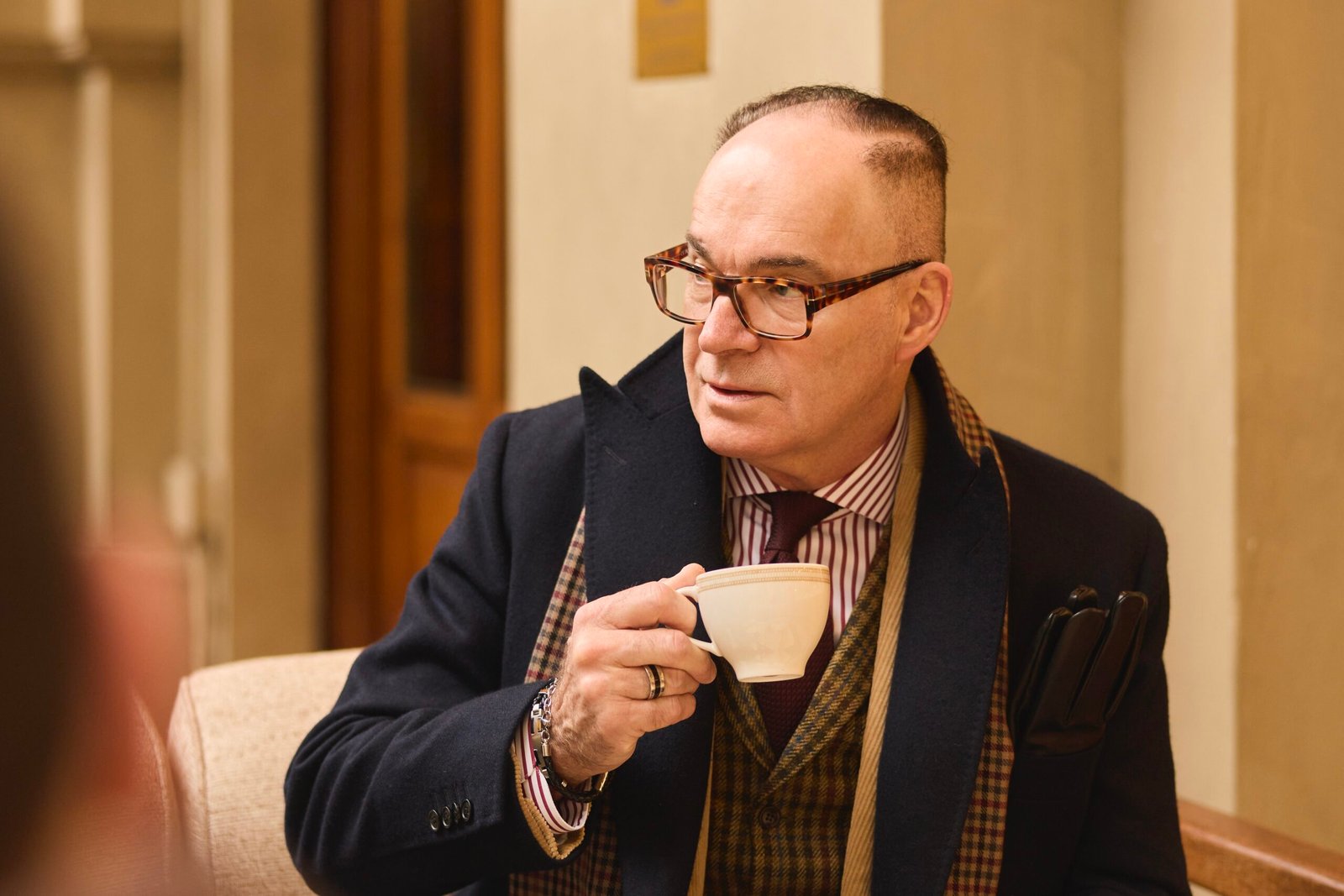 Pour compléter cet ensemble, une cravate en gabardine bordeaux de Blandin & Delloye et une écharpe en laine aux motifs de La Maison Simons ajoutent la touche finale. La texture de la gabardine et les motifs soigneusement choisis de l’écharpe enrichissent visuellement l’ensemble, bouclant ainsi une tenue à la fois raffinée et moderne.